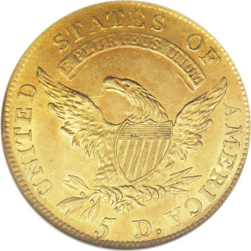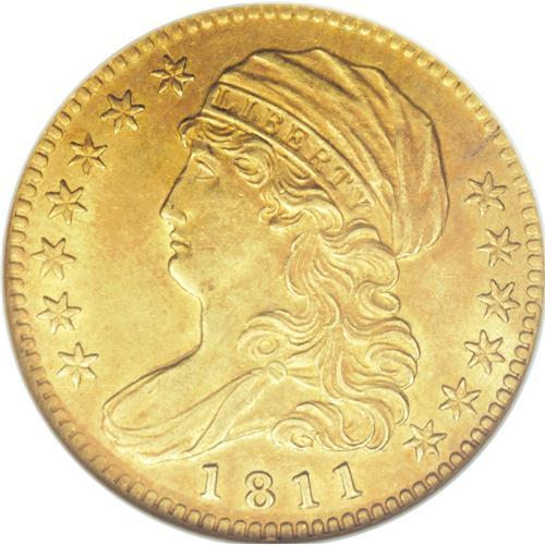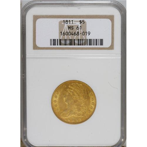 <B>1811 $5 Tall 5 MS61 NGC.</B></I> Breen-6463, BD-1, High R.3. The two varieties of 1811 half eagle are easily distinguished by the height of the 5 in the denomination. The Bass-Dannreuther <I>Early U.S. Gold Coin Varieties 1795-1834</B></I> estimates that the present Tall 5 variety is a bit scarcer, at 175-250 pieces known, than the Small 5 (225-300 known). An 1810-dated obverse was also paired with this Tall 5 reverse, one of two for 1810. The shared 1811 reverse is identifiable by three squat, squashed dentils directly under the 5. The present example shows no trace of circulation, as expected for the grade, but the surfaces are somewhat lackluster, with a few light scrapes and ticks on each side. The area around STATES and the motto on the reverse is somewhat softly struck. Both sides exhibit light, even reddish patina.<BR><BR><b>Shipping:</b> Coins & Currency (<a target="_blank" href="http://www.heritageauctions.com/common/shipping.php">view shipping information</a>)