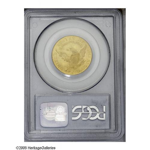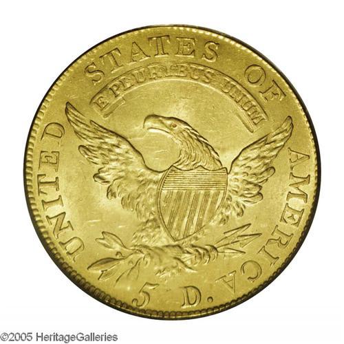 <B>1811<$5> Tall 5 MS63 PCGS.</B></I> Breen-6463, B. 1-A, Miller-115, R.4.Only two die varieties exist for the 1811 issue, which are readily distinguished by the size of the 5 in the denomination. The Tall 5 variety is considered to be the more common of the two. The present example is from a sharp strike and has satiny green-gold color. The luster, although a bit subdued, is quite extensive for the grade. There are no singularly mentionable abrasions. There is a hint of die clash showing on each side. A pleasing Mint State example of this scarce variety. Population: 12 in 63, 8 finer (10/05).<BR><I>From The Frank Manthey Collection of Gold Coins.</B></I>
