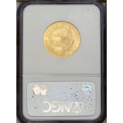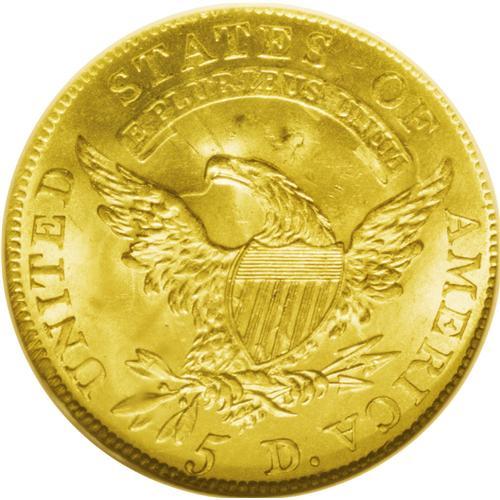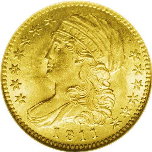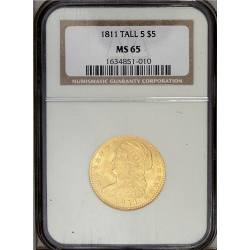 <B>1811<$5> Tall 5 MS65 NGC.</B></I> B. 1-A, Breen-6463, Miller-115, R.4. The Tall 5 die marriage is quite scarcer, and clearly rarer than the Small 5 variety, the only other known die variety of the year. These varieties are easily distinguished by the size of the digit 5 in the denomination. The half eagle coinage of 1811 consisted of 99,851 coins, according to Mint records, although the real total may have been a much smaller number. The two varieties are similar in rarity, and many of the first or Tall 5 variety were coined before other half eagles dated 1810, thus the confusion surrounding the mintage. Walter Breen suggested that over half of the mintage, or more than 50,000 coins, were actually dated 1810. Of course, there may also have been a quantity of 1811 half eagles produced in 1812 and recorded in the mintage for that year. This discussion illustrates just one of the problems facing researchers who are examining early Mint history.<BR> A number of prominent clash marks are evident, especially on the obverse. The scroll and its lettering are visible beneath the bust, continuing into the left obverse field. The eagle's feather details can be seen in the left and right obverse field, the denomination is visible above Liberty's cap, the leaves at the front of the cap, and the arrows behind the cap. Clash marks are also visible on the reverse, but they are not nearly as prominent. The orientation of these clash marks provides a fascinating study. When this example was coined, the reverse die was rotated about 45 degrees counterclockwise. The clashing accident also occurred with the reverse die similarly rotated. A numismatic challenge would be the discovery of other examples, with the dies returned to normal alignment, yet with the clash marks from this rotation.<BR> This is a frosty and highly lustrous example with brilliant light yellow-gold surfaces. Both side