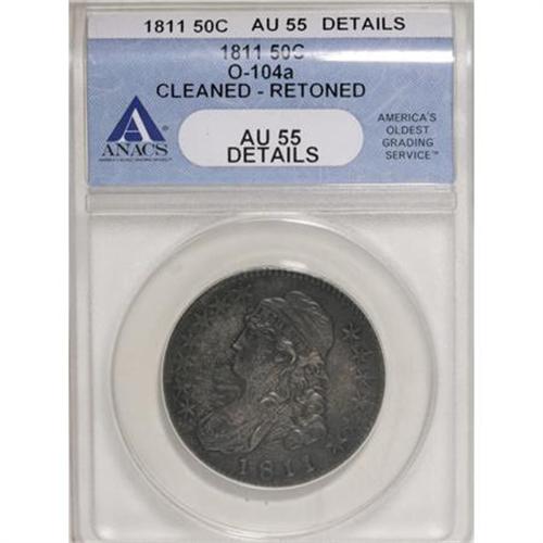 <B>1811 50C Large 8--Cleaned, Retoned--ANACS. AU55 Details.</B></I> O-104a. NGC Census: (55/276). PCGS Population (44/136). Mintage: 1,203,644. Numismedia Wsl. Price for NGC/PCGS coin in AU55: $550. (#6096)<BR><BR><B>Coin Engraver:</B> John Reich<BR><BR><b>Shipping:</b> Coins & Currency (<a target="_blank" href="http://www.heritageauctions.com/common/shipping.php">view shipping information</a>)