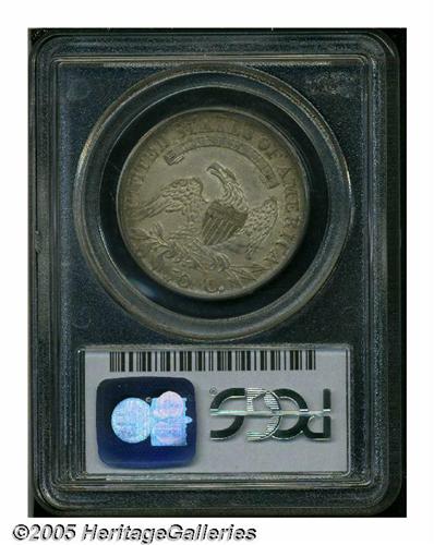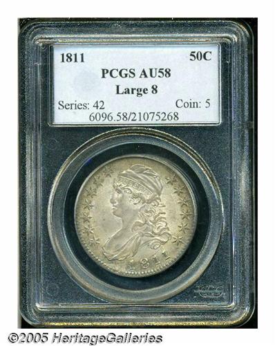 <B>1811<50C> Large 8 AU58 PCGS.</B></I> O-104a, R.1. One of only two Large 8 die pairings for the date, Overton-104a is promptly identified by its semi-circular obverse die crack. Bluish-gray patina is imbued with faint rose undertones. The design elements display nice definition, save for softness in a couple of the star centers.