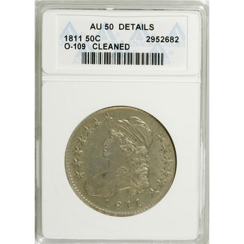 <B>1811 50C Small 8--Cleaned--ANACS. AU50 Details.</B></I> O-109, R.2. PCGS Population (13/103). Mintage: 1,203,644. Numismedia Wsl. Price: $300. (#6097)<BR><BR><b>Shipping:</b> Coins & Currency (<a target="_blank" href="http://www.heritageauctions.com/common/shipping.php">view shipping information</a>)