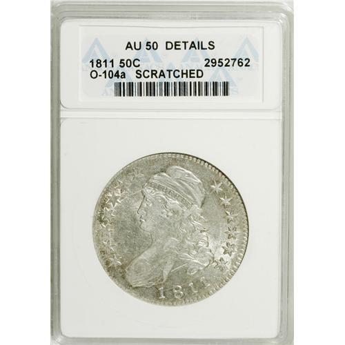 <B>1811 50C Large 8--Scratched--ANACS. AU50 Details.</B></I> O-104a, R.1. NGC Census: (27/352). PCGS Population (34/196). Mintage: 1,203,644. Numismedia Wsl. Price: $300. (#6096)<BR><BR><b>Shipping:</b> Coins & Currency (<a target="_blank" href="http://www.heritageauctions.com/common/shipping.php">view shipping information</a>)