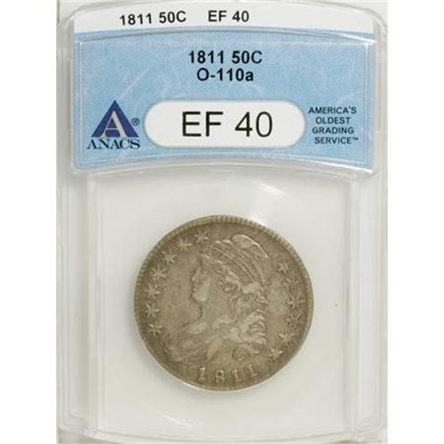 <B>1811 50C Large 8 XF40 ANACS.</B></I> O-110a. NGC Census: (14/432). PCGS Population (15/252). Mintage: 1,203,644. Numismedia Wsl. Price for NGC/PCGS coin in XF40: $175. (#6096)<BR><BR><B>Coin Engraver:</B> John Reich<BR><BR><b>Shipping:</b> Coins & Currency (<a target="_blank" href="http://www.heritageauctions.com/common/shipping.php">view shipping information</a>\)