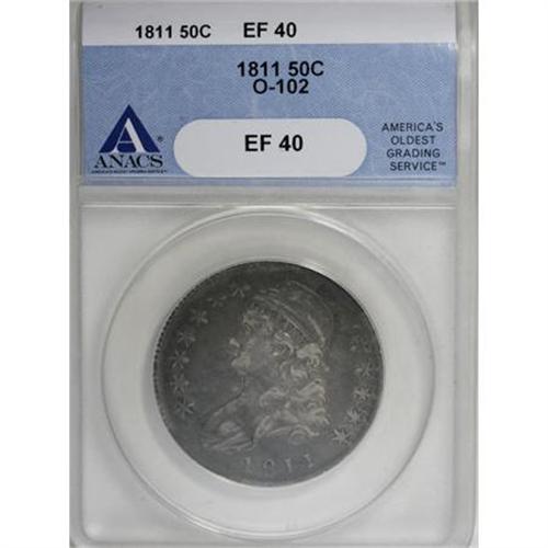<B>1811/10 50C XF40 ANACS.</B></I> O-102, R.4. A prominent "dot", presumed to be the remnant of a previously punched numeral 1, resides between 8 and 1 in the date, just above the rim. On the reverse, the first and third crossbars of the shield extend well into the eagle's right (facing) wing. This example is moderately worn and shows a heavy coating of olive-brown coloration across both sides. <BR><BR><B>Coin Engraver:</B> John Reich<BR><BR><b>Shipping:</b> Coins & Currency (<a target="_blank" href="http://www.heritageauctions.com/common/shipping.php">view shipping information</a>)