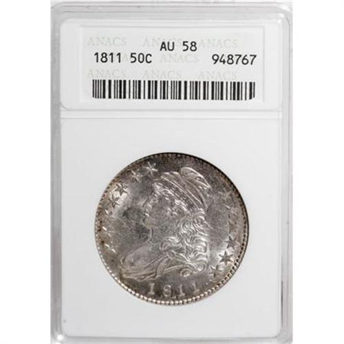 <B>1811 50C Small 8 AU58 ANACS.</B></I> O-105a, R.2. Dashes of golden-brown toning cling to the borders. Luster dominates all but the open fields. The right-side borders are typically brought up, but the remainder of the strike is bold. Struck from multiply clashed dies.<BR><I>From The Casa Becca del Norté Collection.</B></I><BR><BR><B>Coin Engraver:</B> John Reich<BR><BR><b>Shipping:</b> Coins & Currency (<a target="_blank" href="http://www.heritageauctions.com/common/shipping.php">view shipping information</a>)
