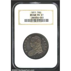 1811 50C Small 8 MS61 NGC. O-105, R.2. Lovely lilac and sea-green patina. The centers are nicely struck, although a few of the stars are somewhat flat. The fields are only lightly abraded, but the luster, while complete, lacks the punch that is required of a higher grade. Important notice: We expect to be auctioning lots at the rate of 200-250 per hour. Sometimes eBay Premier live bid software cannot keep up with that pace, so we strongly recommend that you place a realistic proxy bid now as insurance to avoid disappointment. Also please note that all Heritage/CAA lots purchased through eBay Premier carry a 20% Buyer's Premium. Please make sure you read the Terms and Conditions.