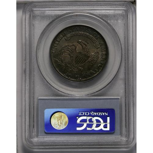 <B>1811<50C> Small 8 MS62 PCGS.</B></I> O-111a, R.1. The diagnostic die defect below Liberty's ear and the late-state reverse die cracks attribute this pleasing specimen. Light gray patina with pale blue and gold traces cover the lustrous surfaces. Some weakness on the clasp is the only variation from an otherwise strong and well-centered strike. Scattered marks limit the grade.