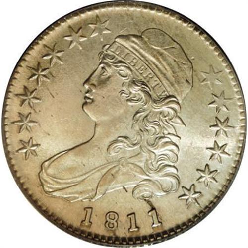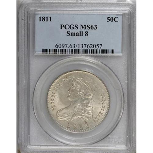 <B>1811 50C Small 8 MS63 PCGS.</B></I> O-107, R.4. This is a scarce 1811 half dollar variety, seldom found in higher Mint State grades. Possibly a Condition Census example, this piece is fully lustrous with satiny silver surfaces and faint traces of gold color. The upper obverse and lower reverse a weakly defined, suggesting either problems with die alignment in the press or perhaps a slightly tapered planchet.<BR><BR><B>Coin Engraver:</B> John Reich<BR><BR><b>Shipping:</b> Coins & Currency (<a target="_blank" href="http://www.heritageauctions.com/common/shipping.php">view shipping information</a>)