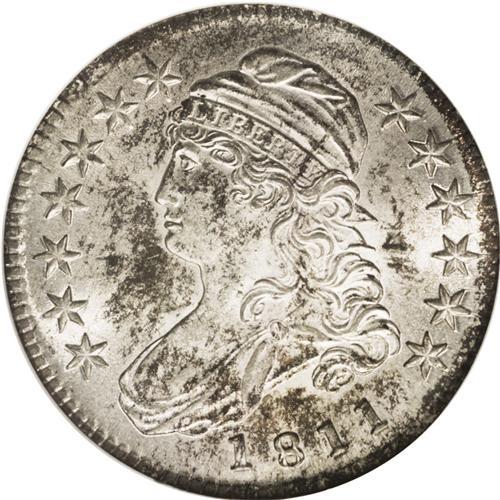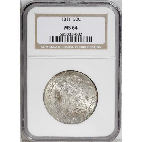 <B>1811<50C> Small 8 MS64 NGC.</B></I> O-110a, R.2. Blushes of autumn-brown grace the fields, although portions of this well struck near-Gem are untoned. Luster is vivacious, and the strike is sharp save for a couple of upper left stars. Overton-110a is identified by the die crack above UNITED, in addition to the left-leaning date and the joined bases of the AM in AMERICA.