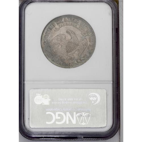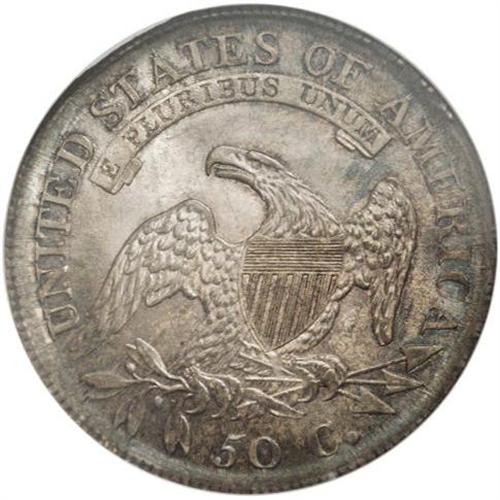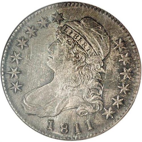 <B>1811<50C> Small 8 MS65 NGC.</B></I> O-110a, R.1. Identifiable by the leftward slant of the digits in the date, and the center dot between crossbars 4 and 5. This later die state shows a die crack that starts below the olive leaves, continues through the tops of UNITED, and terminates above the first S in STATES. At this grade level, this piece is tied with several other Gems, suggesting this production run may have been set aside for many years in a vault as part of a bank's cash reserves. Sharply struck in all areas, the surfaces are lustrous with an overlay of mottled deep gray and blue toning on each side.