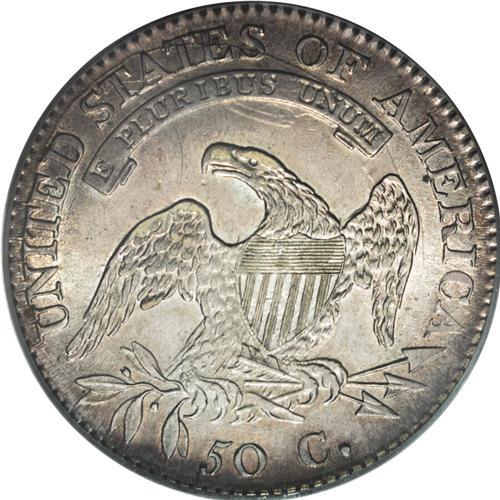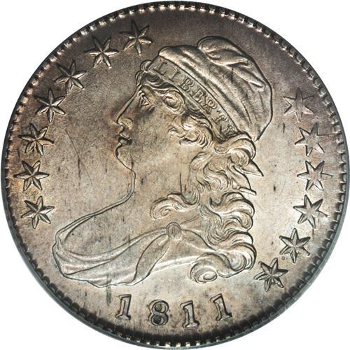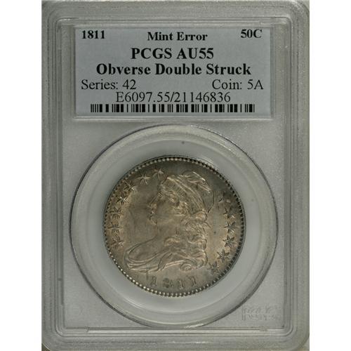 <B>1811 50C Small 8--Obverse Double Struck--AU55 PCGS.</B></I> O-105a, R.2. This example was struck twice by the dies. The obverse (or hammer) die rotated slightly counterclockwise between strikes, while the reverse (or anvil) die was stationary. Thus, the reverse is merely well struck, while obverse design elements exhibit ghostly outlines, particularly on the date and profile. Toned light golden-gray, with ample luster and only a few moderate field marks.<BR><BR><b>Shipping:</b> Coin/Currency (<a target="_blank" href="http://www.heritageauctions.com/common/shipping.php">view shipping information</a>)