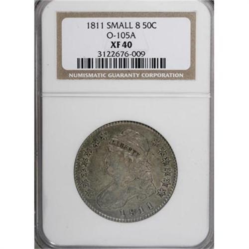 <B>1811 50C Small 8 XF40 NGC.</B></I> O-105A. NGC Census: (0/0). PCGS Population (11/152). (#6097)<BR><BR><B>Coin Engraver:</B> John Reich<BR><BR><b>Shipping:</b> Coins & Currency (<a target="_blank" href="http://www.heritageauctions.com/common/shipping.php">view shipping information</a>)