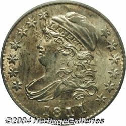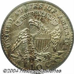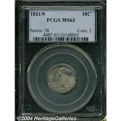 <B>1811/9<10C> MS63 PCGS.</B></I> JR-1, the only variety, R.3. This is a later state of the dies with multiple die cracks evident on the reverse. The surfaces are unquestionably original with variegated shades of silver-gray to medium rose colorations. The luster is complete, and a vertical toning stripe is seen across the reverse. The striking details are unusually bold for a coin struck from a screw press, and notable die clashing is seen in the obverse field. Population: 7 in 63, 5 finer (9/04). <BR><BR><B>Important notice:</B> Heritage usually auctions material at the rate of 200-250 lots per hour. On some occasions eBay Live bid software or the Internet may not be able to keep up with the pace of the auction. We recommend placing a realistic absentee bid now as insurance to avoid disappointment. Occasionally the auctioneer may eliminate or reject an eBay Live bid, and the auctioneer may also reopen a lot after the close of the eBay live bidding (usually because we missed an audience bid), and may reject your bid even if it shows you as the winning bidder. By bidding via eBay Live, you agree that Heritage may award the lot to another bidder at its sole discretion under the circumstances described above or any other reasonable circumstances. Since eBay bids are not shown to us until we open the lot on the floor, we treat those bids just like floor bids. In most cases the floor responds before the eBay bid is presented to us, due to Internet lag time, so for consistency we have made it a policy that floor bids are always considered first over tie eBay live bids. Also please note that all Heritage lots purchased through eBay Live carry a 20% Buyer's Premium. Please make sure you read the Terms and Conditions before you bid.