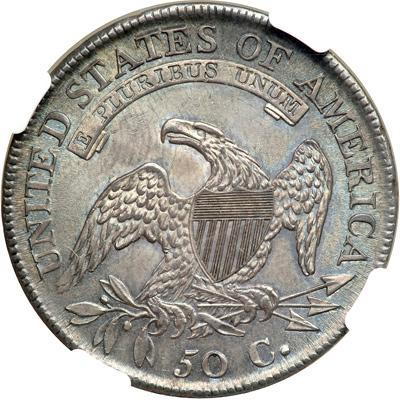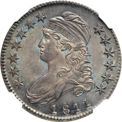 1811 Capped Bust Half Dollar. . O-110. NGC graded MS-64. Mostly well struck, the stars are not fully defined. A beautiful example, fully lustrous and overlaid with a uniform blending of violet and electric blue. A stunning example! Pop 34; 25 finer.