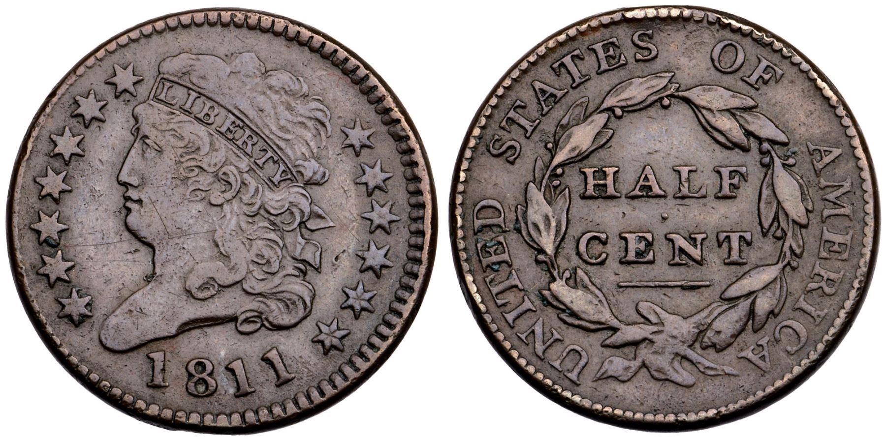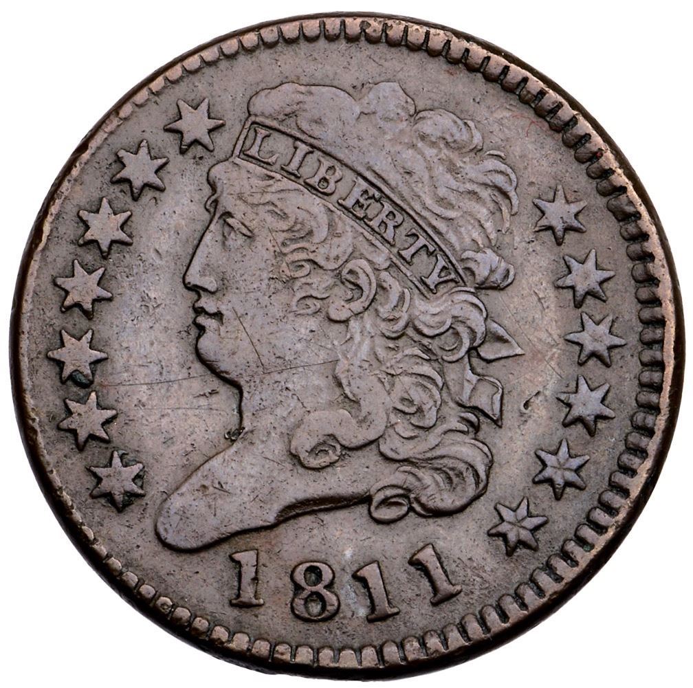 1811 C-1 R-4 F15VF sharpness but there are a few old hairlines on the portrait, a couple before the neck, and a few specks of old verdigris at TED in UNITED. There are also a few minor bruises on the rims, the only worth noting at the last S in STATES. Glossy smooth surfaces, overall pleasing for this scarce variety. EDS, Manley state 1.0.Certificate Number: Pedigree: Ex Dr. Charles Ruby-Pine Tree 6/1978:333-Goldberg 10/1/2001:84 George Mouhtouris - American Numismatic Rarities 9/18/2005:31 - Bob Kebler Collection