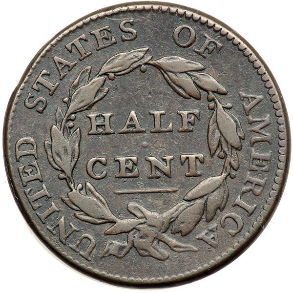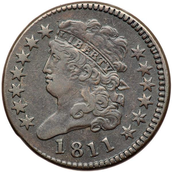 1811 C-1 R4 VF25. Choice glossy chocolate and olive brown. Smooth and very attractive, nearly flawless. The only notable marks, and they are microscopic, are a couple very tiny pinpricks left of star 12 and a very light scratch above the second S in STATES. EDS, Manley state 1.0. The dentils are sharply impressed and there is no trace of a crack at stars 1-4. Struck slightly off center to K-9 with the reverse rotated 10 degrees CW. A premium example of this tough date. Noyes photo #74341.