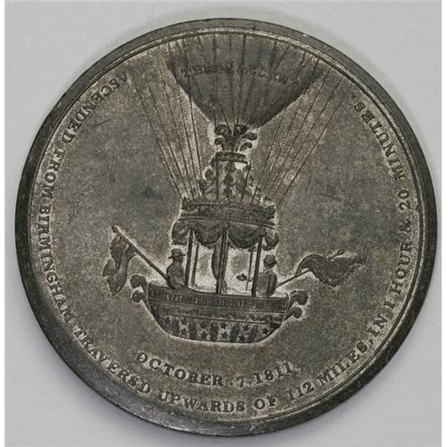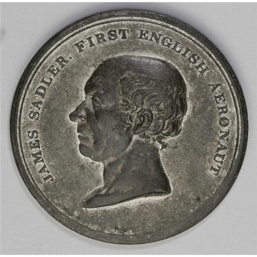 <B>1811 James Sadler Medal in White Metal, Fine 12.</B></I> 52mm, plain edge, by Peter Wyon. Obverse: bust of Sadler facing left; around: James Sadler. First English Aeronaut. P.W.F in exergue. Reverse: balloon and gondola ascending in the center; around: Ascended From Birmingham. Traversed Upwards Of 112 Miles, In 1 Hour & 20 Minutes. October. 7, 1811 below the gondola. On the balloon: The 21 Ascent.