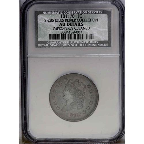 <B>1811/0<1C> S-286, B-2, R.3--Improperly Cleaned--NCS. AU Details. XF40 EAC.</B></I> State II. A high grade coin for the variety, and within Breen's Condition Census even though cleaned. Light brown color with smooth surfaces. An example that would be a choice coin for anyone interested in owning a high grade overdate of this year. The defect under the E of ONE on the reverse is on all coins from this die. This is the most difficult Classic Head variety to find in high grade. No Mint State examples (according to EAC standards) exist. We had the honor of selling the finest known, a choice AU-55, in our Wes Rasmussen sale.<BR><I>Ex: George Ramont (2/17/1995).</B></I> Envelope Included.