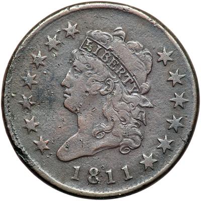 1811 S-287 R2. VG-10. Turban Head. Five points sharper with dull contact marks on the rim at stars 1 & 4 and over ST in STATES, plus tiny pinpricks over the left side of the obverse. The planchet is decent but not perfectly smooth and there is no verdigris. Slightly glossy chocolate and dark steel brown. MDS. The date is bold and the legends are strong.