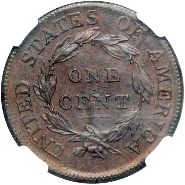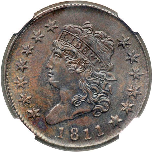 1811 S-287 R2. NGC graded MS-64 Brown. Turban Head. Lustrous chocolate and olive brown mixed with some slightly lighter brown toning on the obverse. Attractive cartwheel luster from fine die flowlines covers both sides and this cent offers excellent eye appeal. The only mark is a horizontal nick on the chin; otherwise this cent is flawless. MDS, Breen state III. An impressive example of this tough date. Our grade is MS60. The die variety is noted on the NGC label. Pop 3; none finer at NGC in Brown.