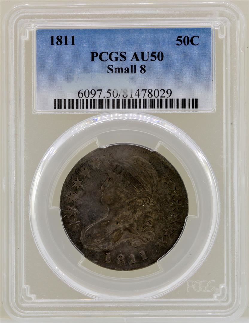 One 1811 Small 8 Capped Bust Half Dollar Coin PCGS AU50. PCGS Graded.