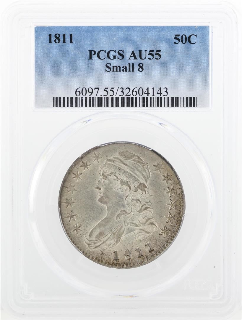 One 1811 Small 8 Capped Bust Half Dollar Coin PCGS AU55. PCGS Graded.