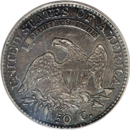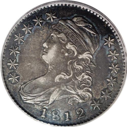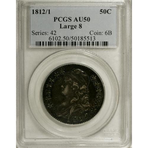 <B>1812/1 50C Large 8 AU50 PCGS.</B></I> O-101, R.5. A very scarce and always-desirable variety among early Bust halves. This piece appears to be tied for second finest known with two other coins. This piece shows only the slightest trace of friction over the highpoints of the design. Otherwise, the surfaces are mostly charcoal-gray. The most notable marks are an X in front of Liberty's neck and a diagonal milling mark just to the right. A rare opportunity for the advanced collector of Bust halves. Not only is this an important R.5 die marriage, but it is also a distinct variety listed in the <I>Guide Book.</B></I> Such pieces are subject to heavy demand from intermediate level collectors, those with an interest in varieties who have not yet begun complete collections by individual die marriages.<BR><I>From The Rocky Top Collection of Bust Half Dollars.</B></I><BR><BR><b>Shipping:</b> Coins & Currency (<a target="_blank" href="http://www.heritageauctions.com/common/shipping.php">view shipping information</a>)