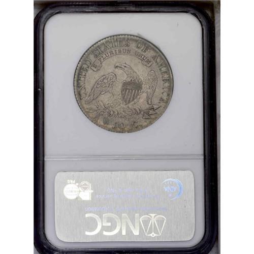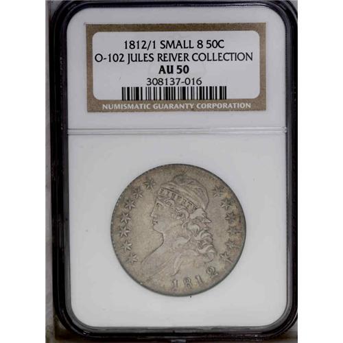 <B>1812/1<50C> Small 8 AU50 NGC.</B></I> O-102, R.2. A clear overdate variety. Surprisingly clean surfaces, the central striking details are quite well brought up, with some peripheral softness, most notably on the stars on the left side of the obverse. A surprising amount of luster remains on each side, for the grade. Pleasing olive-gray and gold color adorns the obverse and the reverse. Faint highpoint wear defines this piece as a lightly circulated example.