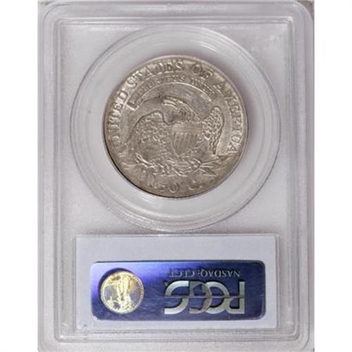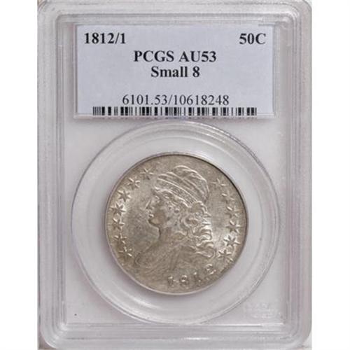 <B>1812/1 50C Small 8 AU53 PCGS.</B></I> O-102, R.2. Luster illuminates the borders and devices of this moderately abraded steel-gray Bust half. The only die marriage for the Small 8 overdate, and thus requisite for a <I>Guide Book</B></I> variety collection. Struck from clashed dies.<BR><BR><B>Coin Engraver:</B> John Reich<BR><BR><b>Shipping:</b> Coins & Currency (<a target="_blank" href="http://www.heritageauctions.com/common/shipping.php">view shipping information</a>\)