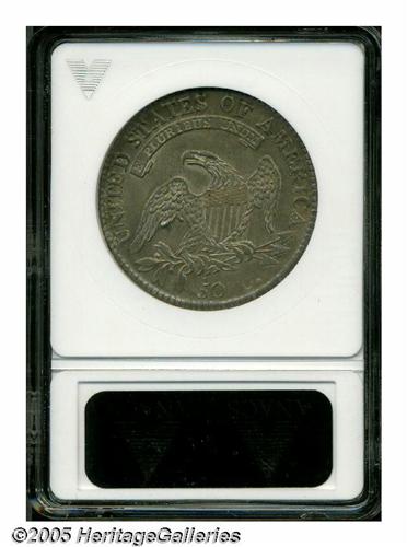 <B>1812/1<50C> Small 8 AU55 ANACS.</B></I> O-102, R.2. Dove-gray and aquamarine colors endow this partly lustrous example. A thin vertical mark above the 0 in the denomination provides the only noticeable contact. The uppermost stars are typically struck, however, the major devices are sharp.