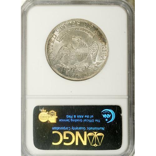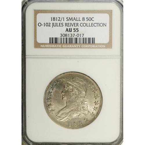 <B>1812/1 50C Small 8 AU55 NGC.</B></I> Ex: Jules Reiver Collection. O-102, R.2. This example is well struck for the issue, despite some weakness that draws the peripheral devices toward the borders, on each side. Nearly as lustrous as a Mint State coin should be, this example is mostly untoned, but reveals a faint degree of purple-rose color in the upper left obverse field, and slight amounts of sky-blue and russet toning near some of the obverse and reverse peripheries. Reiver's collector envelope included.<BR><I>Ex: Jules Reiver Collection, (Heritage, 1/06), lot 22679.</B></I><BR><I>From The Rocky Top Collection of Bust Half Dollars.</B></I><BR><BR><b>Shipping:</b> Coins & Currency (<a target="_blank" href="http://www.heritageauctions.com/common/shipping.php">view shipping information</a>)