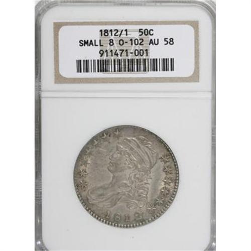 <B>1812/1 50C Small 8 AU58 NGC.</B></I> O-102, R.2. Medium dove-gray and walnut-brown toning enriches this satiny example. Crisply struck aside from left-side stars, and the fields have only a few faint marks.<BR><BR><B>Coin Engraver:</B> John Reich<BR><BR><b>Shipping:</b> Coins & Currency (<a target="_blank" href="http://www.heritageauctions.com/common/shipping.php">view shipping information</a>)