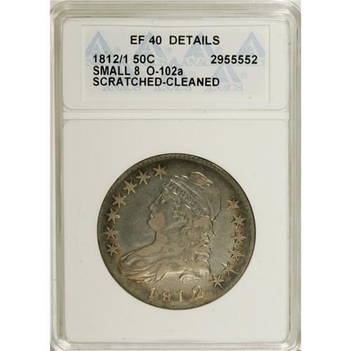 <B>1812/1 50C Small 8--Cleaned, Scratched--ANACS. XF40 Details.</B></I> O-102a. NGC Census: (6/68). PCGS Population (9/56). Numismedia Wsl. Price: $275. (#6101)<BR><BR><b>Shipping:</b> Coins & Currency (<a target="_blank" href="http://www.heritageauctions.com/common/shipping.php">view shipping information</a>)