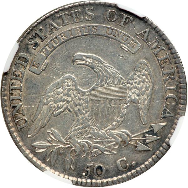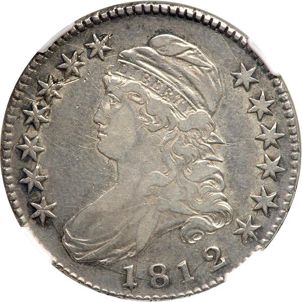 1812/1 Capped Bust Half Dollar. Large 8. Scratches. NGC has a pop of only 6 coins graded for this variety. A scarce piece. The 1812 over 1811 half dollar is rare both with origiinal dies and later fromm shattered dies (as in O-101A). There is a small 8 in the date. N in UNITED is recut at its base. Curiously, the other obverse overdate (O-102) shares the same reverse die as this.