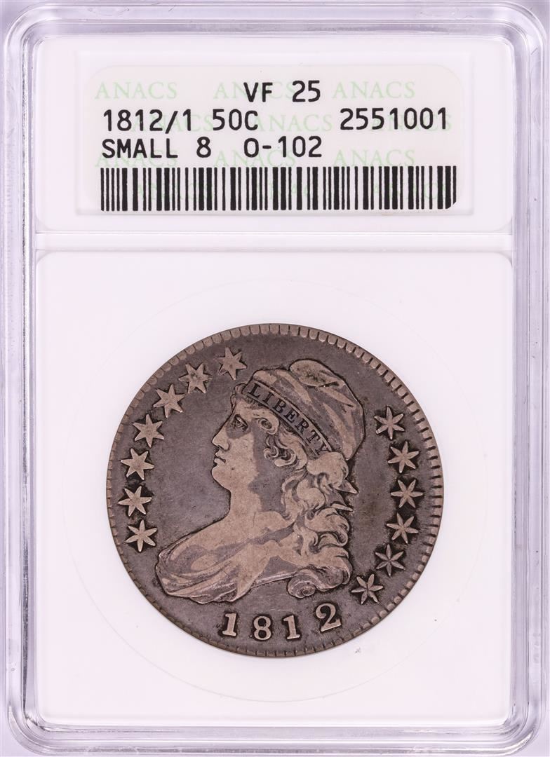 One 1812/1 Small 8 Capped Bust Half Dollar Coin ANACS VF25 O-102. ANACS Certified.