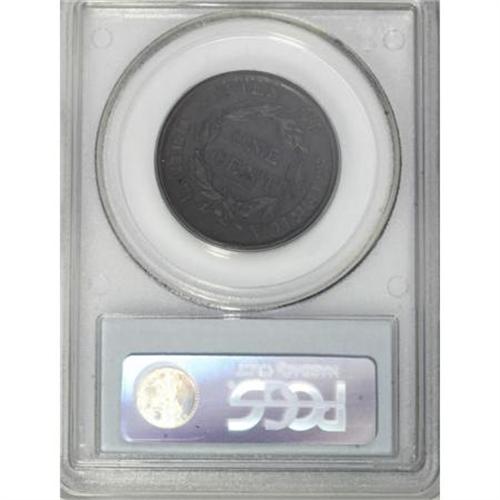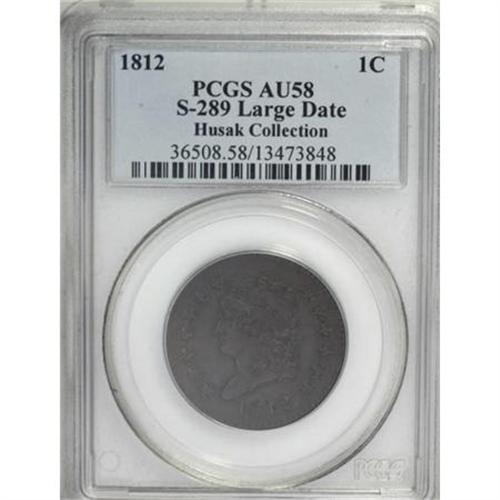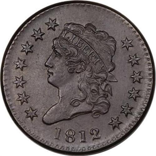 <B>1812 1C Large Date. AU58 PCGS. S-289, B-4, R.1. </B></I> <B>Noyes XF40; CC-12. Photo #21298. Our EAC Grade XF45.<BR><BR>Equivalents. </B></I>Proskey 2; Doughty 218; McGirk 2A; Clapp 2; EAC 4; <I>Encyclopedia </B></I>1784; PCGS #1564.<BR><B><BR>Variety. </B></I>Large wide date. Leaf point midway between S and O. The obverse appears on S-289. The reverse appears on S-289.<BR><B><BR>Surfaces. </B></I>The surfaces have a somewhat matte or dull appearance, yet exhibit attractive olive color with traces of lighter tan and darker steel. The central obverse and reverse designs are nicely brought up, and the strike is well-centered. The obverse has nearly full border dentils, although some are quite narrow, while the reverse has a plain raised lip for its border.<BR><B><BR>Die State IV. </B></I>A late die state example with several sets of prominent clash marks on the reverse, and peripheral flowlines on both sides pulling the stars, date, and legend toward the rim. Pete Smith recorded only two die states, but commented: "If each die clash produced a distinct die state, there would be several intermediate states in addition to those listed."<BR><BR><B>Census. </B></I>Just one Mint State piece is known to Noyes, but two are recorded by Del Bland. Although not a rarity, the 10th best in Noyes' list grades just XF45, and just 20 coins grade XF40 or finer.<BR><BR><B>Commentary. </B></I>The 1812 S-289 cent is elusive in higher grades, despite its ranking as a common variety. An enumeration of the 10 finest pieces of each Classic Head cent reveals that S-289 has the fourth lowest point total. When Walter Breen's <I>Large Cent Encyclopedia</B></I> was being edited, access to a high grade example was not available, thus the plate coin is a poor reproduction of an earlier Bowers and Merena auction photo.<BR><BR><B>Provenance. </B></I><I>Douglas Bird; Superior (1/2004), lot 1280, $6,900; Thomas Reynolds (6/2005).</B></I><BR><BR><B>Personality. Superior, </B></I>the rare coin firm started by the Goldberg family in the 1930s, has undergone a few ownership changes in the past decade. The firm handled several important copper sales in the 1970s, 1980s, and 1990s, including the three-part Ruby Collection, three different sales of Robinson S. Brown, Jr., the Jack Robinson Collection, and others.<BR><BR><b>Shipping:</b> Coins & Currency (<a target="_blank" href="http://www.heritageauctions.com/common/shipping.php">view shipping information</a>)