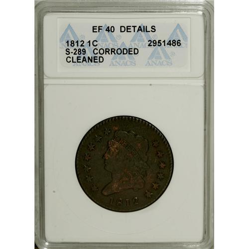 <B>1812 1C Large Date--Cleaned, Corroded--ANACS. XF40 Details.</B></I> S-289, B-4, R.1. NGC Census: (0/0). PCGS Population (4/14). Numismedia Wsl. Price: $750. (#1564)<BR><BR><b>Shipping:</b> Coins & Currency (<a target="_blank" href="http://www.heritageauctions.com/common/shipping.php">view shipping information</a>)