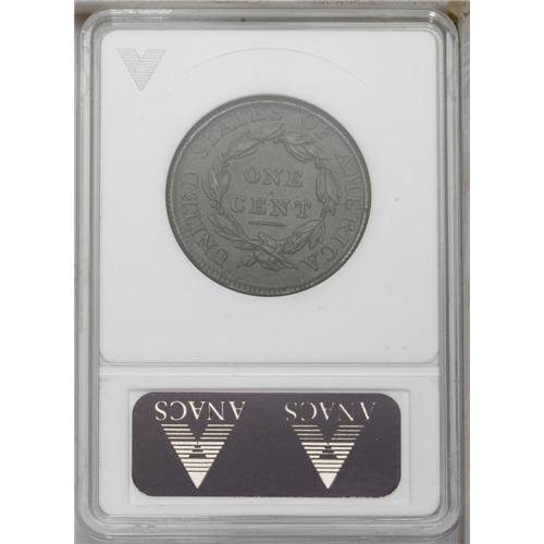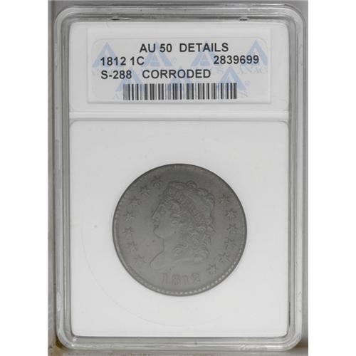 <B>1812<1C> Large Date--Corroded--ANACS. AU50 Details.</B></I> S-288, R.2. This medium to dark brown example has pleasing definition, and some mint luster is evident when the piece is rotated. Corrosion is trivial, but moderate marks are present on the profile, near the N in CENT, and on the reverse rim at 3 o'clock. EAC 25. <BR><BR><B>Important notice:</B> Heritage usually auctions material at the rate of 200-250 lots per hour. On some occasions eBay Live bid software or the Internet may not be able to keep up with the pace of the auction. We recommend placing a realistic absentee bid now as insurance to avoid disappointment. Occasionally the auctioneer may eliminate or reject an eBay Live bid, and the auctioneer may also reopen a lot after the close of the eBay live bidding (usually because we missed an audience bid), and may reject your bid even if it shows you as the winning bidder. By bidding via eBay Live, you agree that Heritage may award the lot to another bidder at its sole discretion under the circumstances described above or any other reasonable circumstances. Since eBay bids are not shown to us until we open the lot on the floor, we treat those bids just like floor bids. In most cases the floor responds before the eBay bid is presented to us, due to Internet lag time, so for consistency we have made it a policy that floor bids are always considered first over tie eBay live bids. Also please note that all Heritage lots purchased through eBay Live carry a 20% Buyer's Premium. Please make sure you read the Terms and Conditions before you bid. This lot is being auctioned in conjunction with a live floor auction by Heritage Galleries & Auctioneers. All final auction and invoice information will be supplied by Heritage Galleries & Auctioneers, and all other information should be considered preliminary. Lot:257 <BR><BR><B>Winning Notification and Billing:</B> After the FINAL session in this auction is complete, Heritage will send e-mail and snail mail invoices. This process normally takes several days. All final auction and invoice information will be supplied by Heritage Galleries & Auctioneers, and all other information should be considered preliminary. <BR><BR>This auction will be conducted on a live auction floor and over the Internet through eBay Live. If you choose to place an absentee bid, please take a moment to <font color='#0000ff'><u><a href='http://pages.ebay.com/liveauctions/help/before/laabsentee.html'>learn how eBay Live absentee bidding works</a></u></font><font color='#000000'>