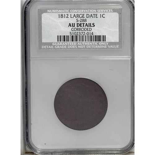 <B>1812<1C> Large Date--Corroded--NCS. AU Details.</B></I> S-288, R.2. A consistently granular piece with dark reddish-brown fields and steel-blue highpoints. A faint pinscratch is noted left of the date. EAC 12.
