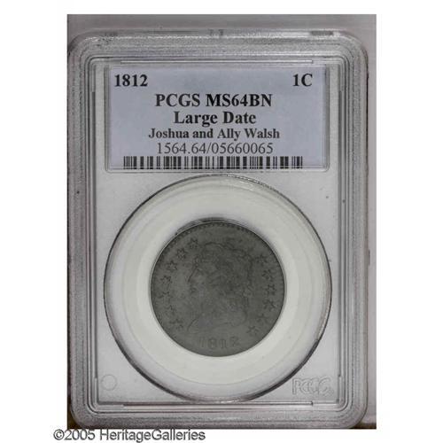 <B>1812<1C> Large Date MS64 Brown PCGS.</B></I> S-289, R.1. Die State II, multiple sets of clash marks (as struck) visible on the reverse field. Deep golden-brown in color, the obverse in addition features hints of gunmetal-blue toning. Sharply struck on the major devices, the stars are also crisp although the fields are flowlined near the rims, due to the die state. The reverse is gorgeously undisturbed. The obverse is also extremely clean, with only two faint slide marks near the nose and a couple of minute flecks of aqua verdigris on the neck. One of the finest examples of the variety. PCGS has only certified four Large Date pieces (S-288 and S-289 combined) as Mint State. Population: 1 in 64, 1 finer (10/05).<BR><I>From The Joshua and Ally Walsh Collection of United States Cents.</B></I>