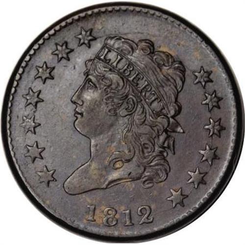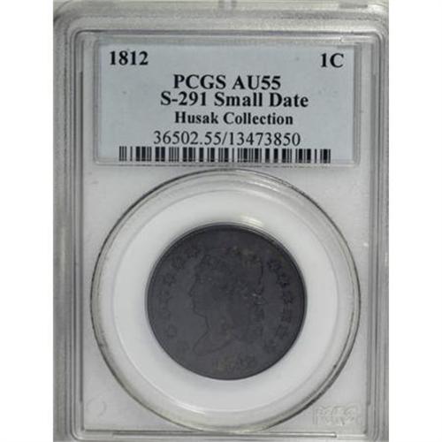 <B>1812 1C Small Date. AU55 PCGS. S-291, B-1, R.2. </B></I> <B>Noyes VF20; tied for CC-22. Photo #59283. Our EAC Grade VF35.<BR><BR>Equivalents. </B></I>Proskey 4; Doughty 220; McGirk 4A; Clapp 4; EAC 1; <I>Encyclopedia </B></I>1783; PCGS #1561.<BR><B><BR>Variety. </B></I>Small date, first 1 leans left. Die chip below upright of E in ONE. The obverse appears on S-291. The reverse appears on 1811 S-286 and 1812 S-291.<BR><B><BR>Surfaces. </B></I>Nearly all of the obverse and reverse are dark steel-brown with a few splashes of lighter tan, mostly on the obverse. The surfaces have the usual small handling marks often seen on the Classic Head cents. Some luster remains visible on both sides, perhaps accounting for the higher commercial grade assigned by PCGS. The lower EAC grade results from a few faint scratches.<BR><B><BR>Die State I </B></I>or perhaps later. Despite the extensive obverse die cracks, this is an early die state. The repunching over E of UNITED, prominent on 1811 S-286, has nearly faded away and the die chip below E of ONE is smaller. The obverse has a crack joining the outer points of stars 1 through 5 and a crack joining the inner points of stars 5 through 7, continuing over the hair curls and disappearing in the upper field nearly over star 8. Another crack joins the 2 with all of the stars on the right, grazing the top of the rear hair curl and ending in the field below the second crack. Another crack joins the bases of 812. This latest crack is described by Breen for Die State III; however, the tops of ATES OF do not merge with a raised ridge as described for Breen's State II.<BR><BR><B>Census. </B></I>Bland is only able to trace a single Mint State example of S-291.<BR><BR><B>Commentary. </B></I>As with a number of other pieces in the Husak Collection, we disagree with the grade given this coin by Bill Noyes. He assigns a sharpness grade of VF30 and deducts 10 points for the surface irregularities. While we agree with a 10-point deduction, we disagree with the initial sharpness grade, which is much too low.<BR><BR>Coinage dies for the Classic Head cents seem much more durable than earlier dies. Although most of the dies show signs of use, including clash marks and flowlines, few actually have die cracks.<BR><BR><B>Provenance. </B></I><I>Thomas Reynolds; Denis W. Loring; 2007 EAC Convention.</B></I><BR><BR><B>Personality. Colonel Mendes I. Cohen</B></I> was born in Richmond in 1796. He enlisted in the army when he was just 16 years old, and served with his brother at Fort McHenry during the War of 1812. After the war, he was employed by the Baltimore Fire Insurance Company, and also in the family banking business. In 1829, when just in his early 30s, Cohen retired from business and spent the next six years touring Europe and the Middle East. His meticulous diaries provide researchers with excellent information about life in the countries he visited. During his travels, he collected many artifacts and relics that were donated to the Johns Hopkins University in 1884. Upon his return from abroad, he was given the title of Colonel by the Maryland governor. He served in the War with Mexico, despite the advanced age of 50 years. Cohen served a term in the Maryland House of Delegates from 1847 to 1848, and later served as a director of the Baltimore and Ohio Railroad.<BR><BR><b>Shipping:</b> Coins & Currency (<a target="_blank" href="http://www.heritageauctions.com/common/shipping.php">view shipping information</a>)