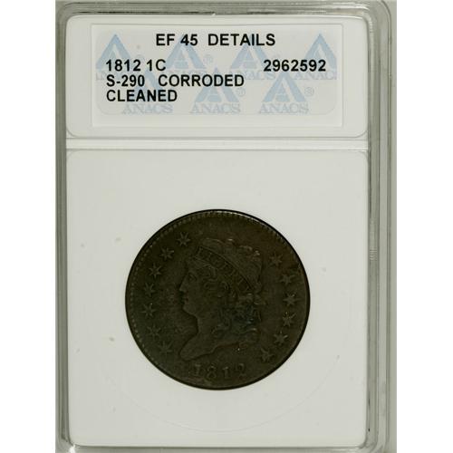 <B>1812 1C Small Date--Cleaned, Corroded--ANACS. XF45 Details.</B></I> S-290. NGC Census: (11/65). PCGS Population (9/42). Mintage: 1,075,500. Numismedia Wsl. Price: $900. (#1561)<BR><BR><b>Shipping:</b> Coins & Currency (<a target="_blank" href="http://www.heritageauctions.com/common/shipping.php">view shipping information</a>)