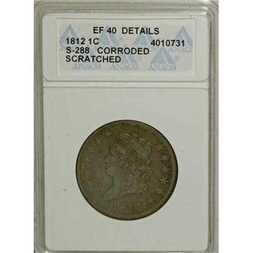 <B>1812 1C Small Date--Corroded, Scratched--ANACS. XF40 Details.</B></I> S-288. NGC Census: (13/77). PCGS Population (21/51). Mintage: 1,075,500. Numismedia Wsl. Price for NGC/PCGS coin in XF40: $725. (#1561)<BR><BR><B>Coin Engraver:</B> John Reich<BR><BR><b>Shipping:</b> Coins & Currency (<a target="_blank" href="http://www.heritageauctions.com/common/shipping.php">view shipping information</a>)