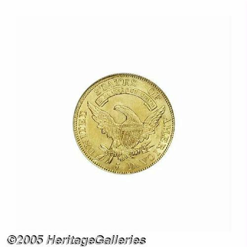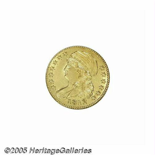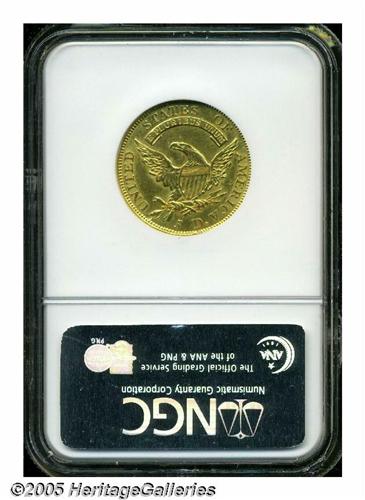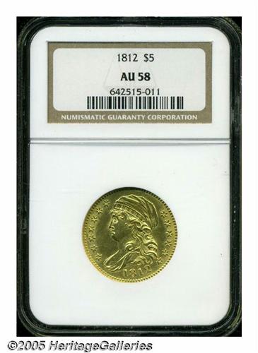 <B>1812<$5> AU58 NGC.</B></I> Wide 5D, Breen-6466, B. 1-B, Miller-118, R.3. Generally well struck with a bright, satiny sheen over richly colored yellow-gold surfaces. A diagnostic die line curves across the eagle's shield, also the location of numerous vertical adjustment marks.