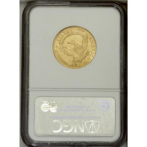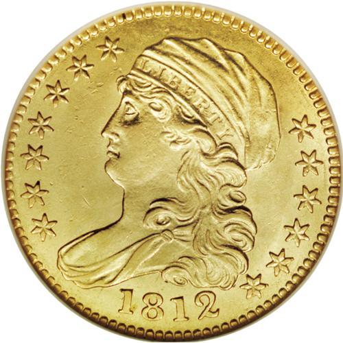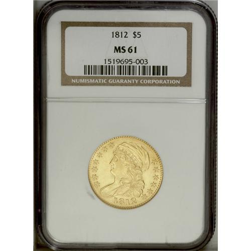 <B>1812 $5 MS61 NGC.</B></I> Wide 5D, Breen-6466, BD-1, R.3. An attractive yellow-gold example with ample luster and a good strike. Only the eagle's neck and the junction of the left (facing) wing are incompletely brought up. One thin mark is found beneath the right scroll end, otherwise quite smooth for the MS61 level. 1812 was the final year of John Reich's Capped Bust Left design. The reverse design was unmodified for the new 1813 type, but the obverse head was enlarged and the cleavage removed. According to Breen, Reich also engraved the device punch for the 1813 to 1815 half eagles, which Chief Engraver Robert Scot modified for the 1818 issues.<BR><BR><b>Shipping:</b> Coin/Currency (<a target="_blank" href="http://www.heritageauctions.com/common/shipping.php">view shipping information</a>)