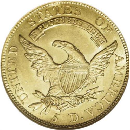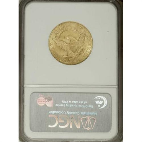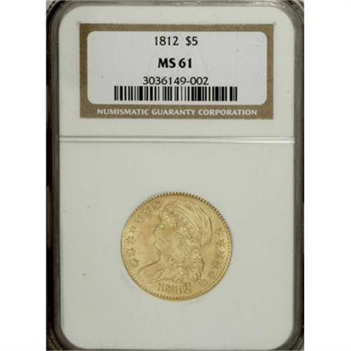 <B>1812 $5 MS61 NGC.</B></I> Wide 5D, Breen-6466, BD-1, R.3. Final year for the Capped Bust to Left design, this date is typical of almost all the years produced of this design type. That is, there are numerous variants seen in the series, including overdates, Small and Large dates, Small and Large denominations, Small and Large 5s, and in this case Wide and Narrow 5 D. Uniformity of design elements was still a couple of decades away, and these early mint products provide collectors with a wider variety of coins to pursue than might at first appear to be the case. <BR> This piece has bright green-gold surfaces. Sharply defined on the obverse, there is a curious softness in the center of the reverse. Generally free from abrasions, the only marks worthy of mention are a number of parallel adjustment marks on the cheek of Liberty. <BR><BR><B>Coin Engraver:</B> John Reich<BR><BR><b>Shipping:</b> Coins & Currency (<a target="_blank" href="http://www.heritageauctions.com/common/shipping.php">view shipping information</a>)