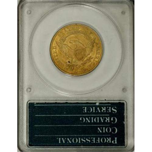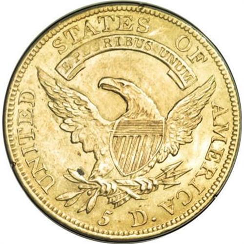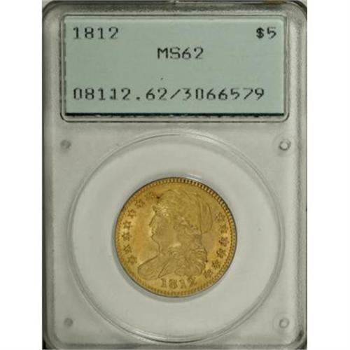 <B>1812 $5 MS62 PCGS.</B></I> Breen-6466, BD-1, R.3. Wide 5 D Reverse. The plentiful 1812 Wide 5 D variety exists to the extent of 300 to 450 coins, according to John Dannreuther. By comparison, only about 80 to 100 examples of the Close 5D variety are known. These two die marriages make up the entire population of 1812 half eagles in all grades. This piece, in a first-generation PCGS holder, is highly lustrous with attractive green-gold and lemon-yellow surfaces. A few dark stains on each side should serve as pedigree identifiers. The eagle's neck and base of the left facing wing are weak, but the balance of the obverse and reverse are sharp. The impression is well-centered with complete obverse and reverse borders.<BR><BR><B>Coin Engraver:</B> John Reich<BR><BR><b>Shipping:</b> Coins & Currency (<a target="_blank" href="http://www.heritageauctions.com/common/shipping.php">view shipping information</a>)
