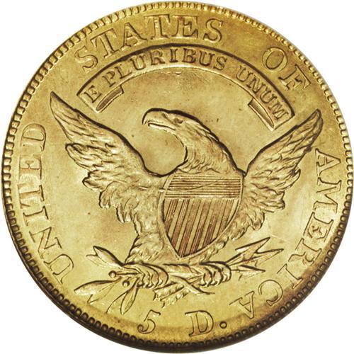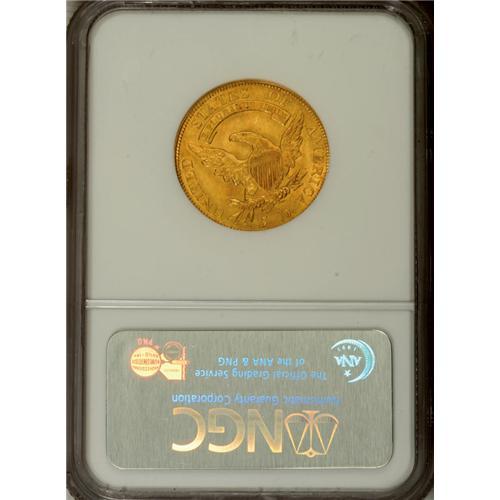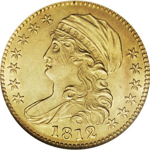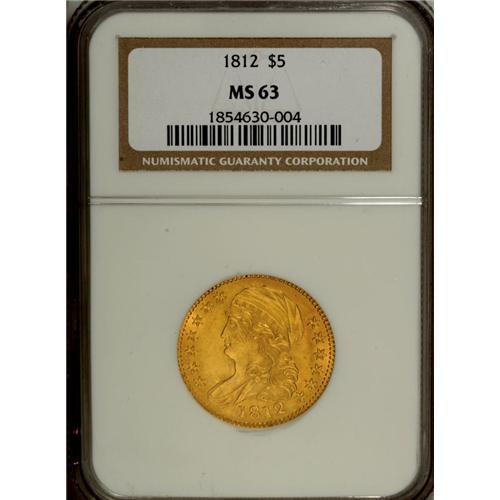 <B>1812 $5 MS63 NGC.</B></I> Wide 5D, Breen-6466, BD-1, R.3. As might be suspected by the presence of several Mint State pieces in the sale, the 1812 is one of the more plentiful dates within the Capped Bust Left series of half eagles. As such, it is a logical candidate to represent this popular early type. The example offered here is notable for outstanding satiny brilliance and largely undisturbed fields. There is a hint of striking softness on the highpoints of the eagle and a series of faint adjustment marks can be detected on Liberty's cheek. Census: 32 in 63, 36 finer (11/06).<BR><BR><b>Shipping:</b> Coin/Currency (<a target="_blank" href="http://www.heritageauctions.com/common/shipping.php">view shipping information</a>)