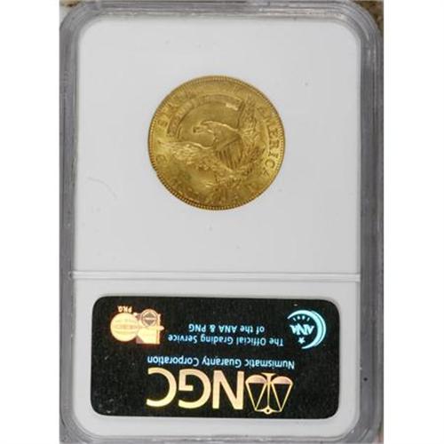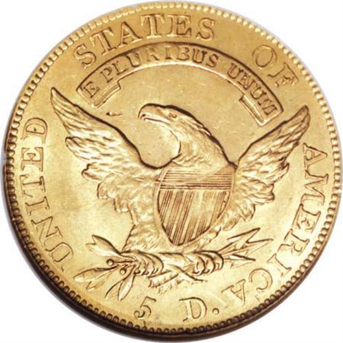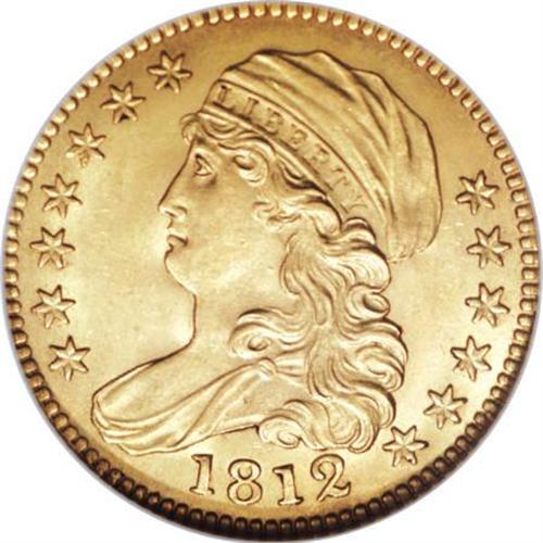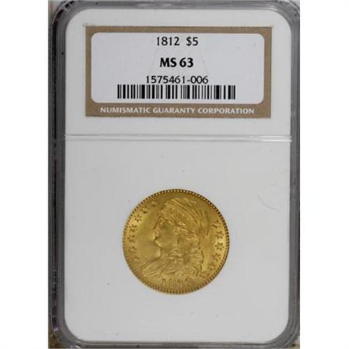 <B>1812 $5 MS63 NGC.</B></I> Breen-6466, BD-1, R.3. The 1812 half eagle comes with two varieties. The obverse is the same for both. The BD-1 has the reverse feather tip positioned over the right edge of the flag of the 5, and a very widely spaced 5 D, the D wholly under the branch (BD-2, the close 5 D has the D mostly under the feather).<BR> An excellent strike has nicely delineated the design features of this Select half eagle, though minor weakness is noted on the eagle's neck and upper shield. Pleasing brass-gold patination imbued with traces of light green occupies both sides. The surfaces show a great amount of luster, and reveal a few minute grade-defining marks. Overall, a nice early five dollar.<BR><BR><B>Coin Engraver:</B> John Reich<BR><BR><b>Shipping:</b> Coins & Currency (<a target="_blank" href="http://www.heritageauctions.com/common/shipping.php">view shipping information</a>\)
